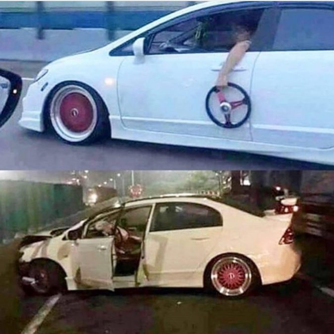 He removed his steering wheel to look cool. What could possibly go wrong?