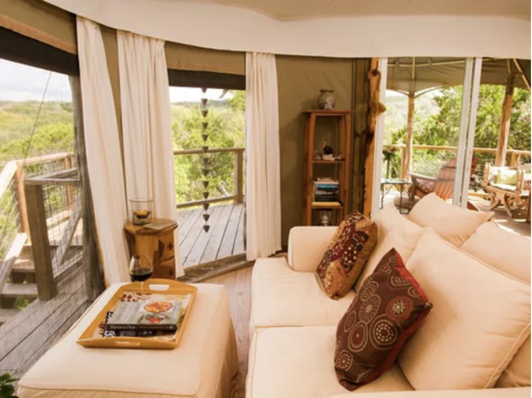 Enjoy the Black Hills of South Dakota in a luxurious safari-style tent with a king size bed and a wood burning stove. This site also offers a suite-sized tent that accommodates a separate lounge area that houses a queen-size leather sleeper sofa. You can find more info on this glamping site here.