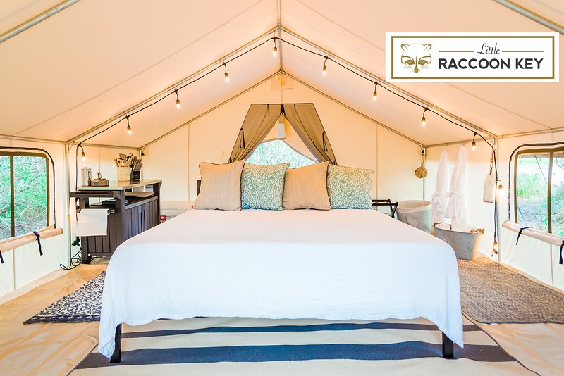 Not only will you stay in a gorgeous glamping tent but you’ll also have an entire island to yourself. This fabulous glamping tent includes a large bed and a bathroom. You’ll enjoy the views of dolphins and lots of birds during your stay. Book your glamping getaway at Little Raccoon Key here.