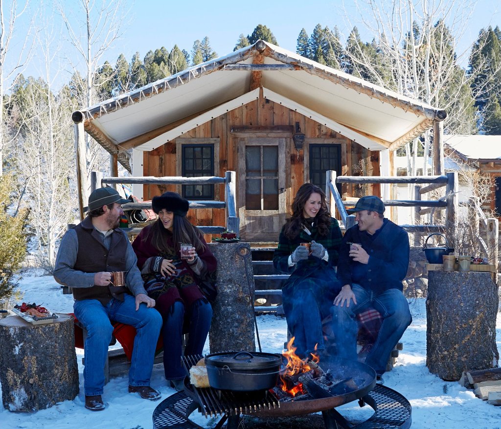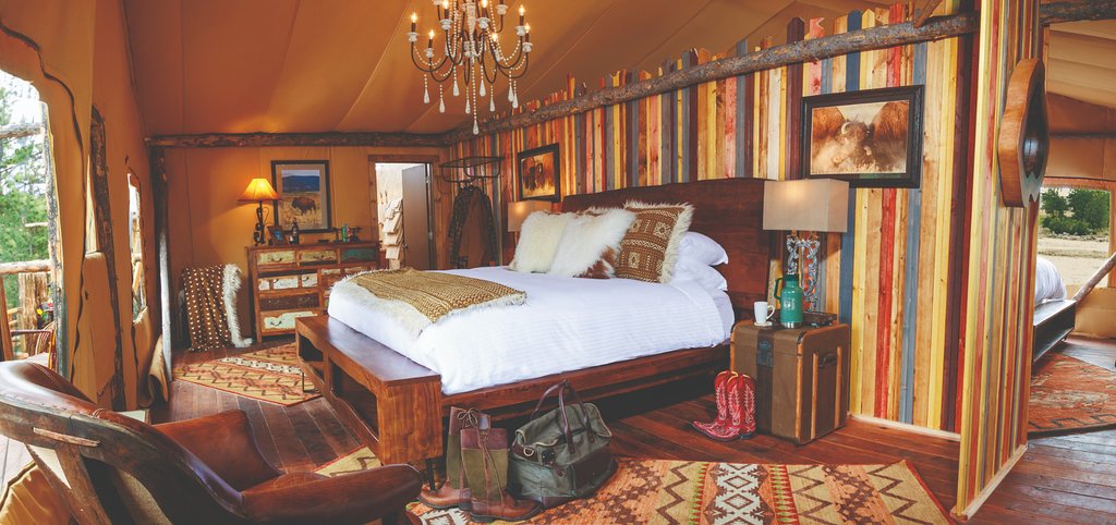 This five-star dude ranch offers both a cabin and tent camping experience in one. They have cabins that house a living room with two canvas tent attached which house the bedrooms. They have not one, but two full bathrooms! They are currently all sold out, but you can check back here.