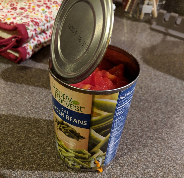 33. “Opened a can of green beans and there were diced tomatoes inside.”