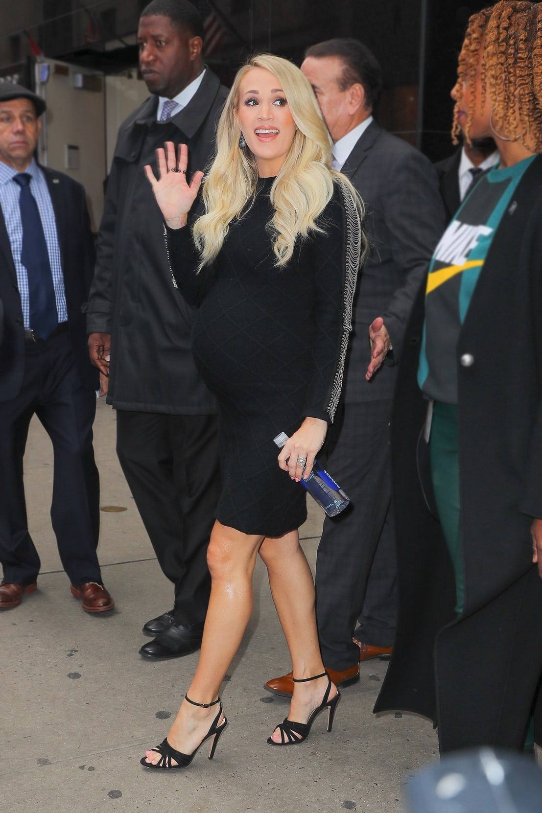 Even a simple black dress looks absolutely fabulous on a pregnant Carrie, and this one even has edgy sleeves to spice things up a bit — because by now we know that Carrie prefers her looks a bit more intricate. The pic was taken this past November while leaving Good Morning America in New York City. And yes, we have to mention it again: Carrie is the queen of showing legs while pregnant, and we are so here for it! The singer always manages to look effortlessly perfect with her baby bump, and we are attributing that to the infamous pregnancy glow!