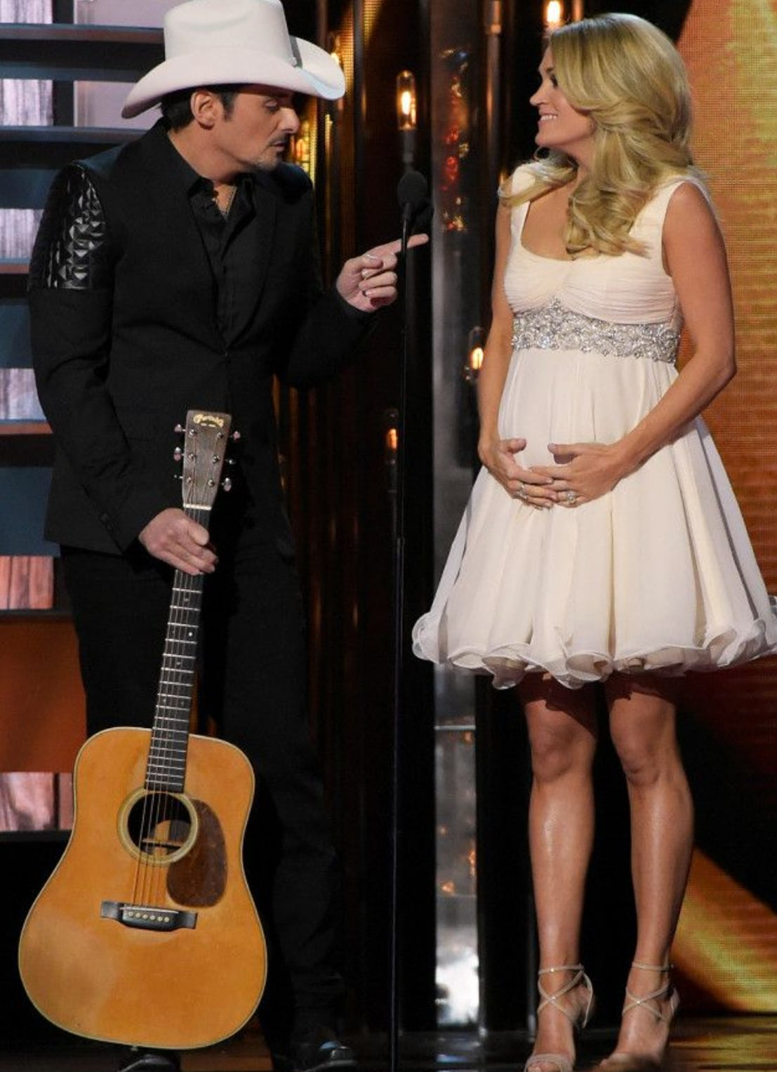 Let’s take a look at one of her more fancy gown looks now. Here’s Carrie at the first-ever Country Countdown Awards at the Music City Center in Nashville. The singer looked stunning in a fitted white gown with gold detailing and a gorgeous, sheer back. This photo is from Carrie’s pregnancy back in 2014, after which she gave birth to her son Isaiah. White definitely suits the singer, and the gown perfectly hugs her baby belly, making sure we all keep our eyes on her. Oh Carrie, pregnancy looks so wonderful on you, we would never think that back pain and swollen feet are a thing!