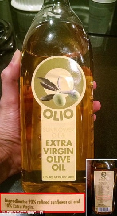 Wait, what do you mean this bottle labeled “olive oil” with the picture of olives on it is actually…almost entirely sunflower oil? Oh yes, there’s the label…in almost transparent writing that you have to squint to see.