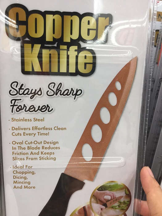 This knife is so fancy, isn’t it? The letters at the top proclaim that it’s a COPPER KNIFE. Apparently, you can call something anything you want as long as you put it on a label. Look at my fancy diamond knife…it’s just stainless steel.
