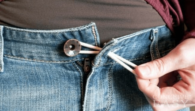 This trick will come in handy both for pregnant women and those who grew out of their jeans. Hook an elastic band around the button, and feed the other end through the buttonhole.