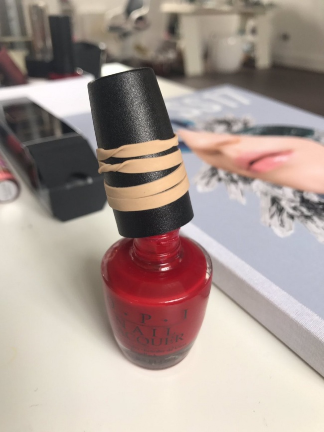 Wrap an elastic band around the cap and easily open a nail polish bottle or any other vessel.