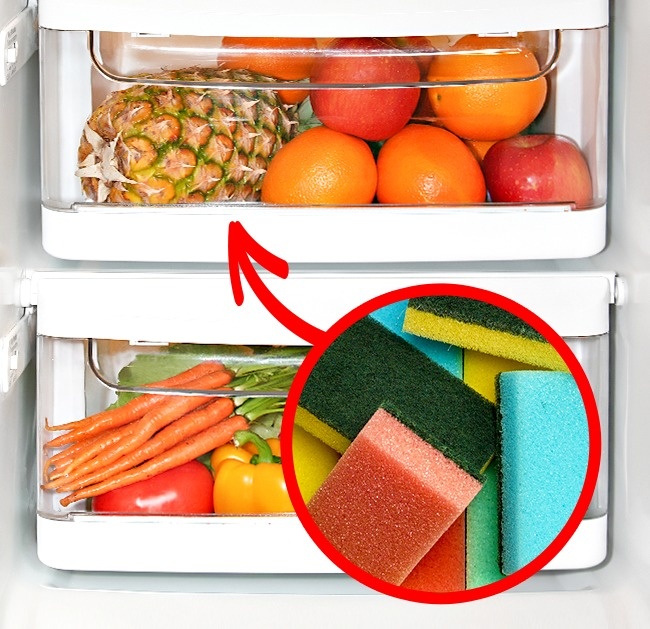 The fruit and vegetable container in your fridge constantly accumulates excess moisture, making its contents spoil faster. Avoid this by putting a new dish sponge inside — it’ll absorb the moisture. Just don’t forget to squeeze and change it.