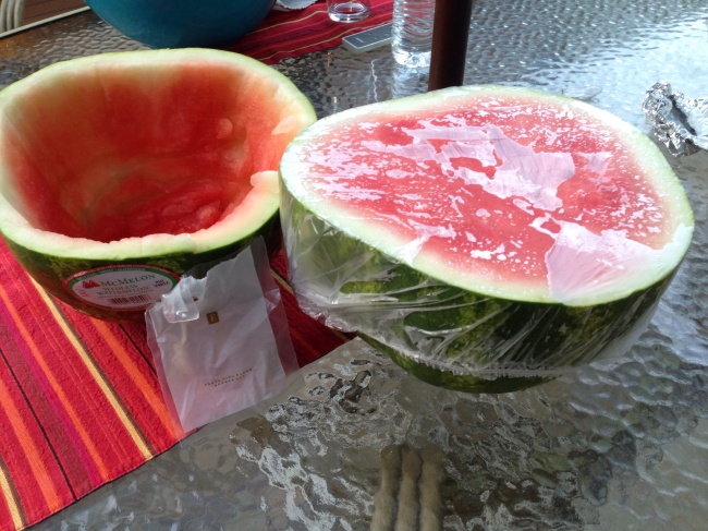 We rarely eat a whole watermelon at once, so it goes into the fridge. And there seems to be nothing more convenient than a shower cap to cover and preserve it.