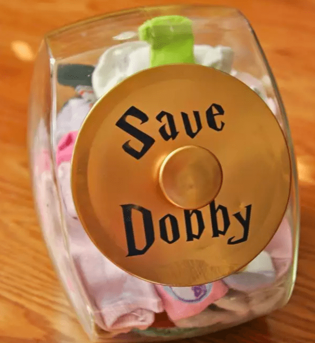Finding socks that have lost their matches can be frustrating, but you can turn it into a fun activity. This “Save Dobby” jar idea is so cute!