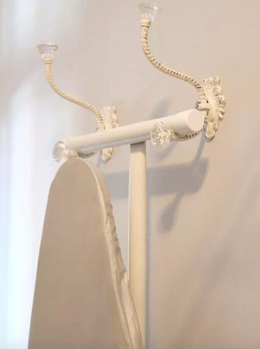 Hang your ironing board on beautiful hooks to give your laundry room a more glamorous vibe. A little decor can really alter a room.