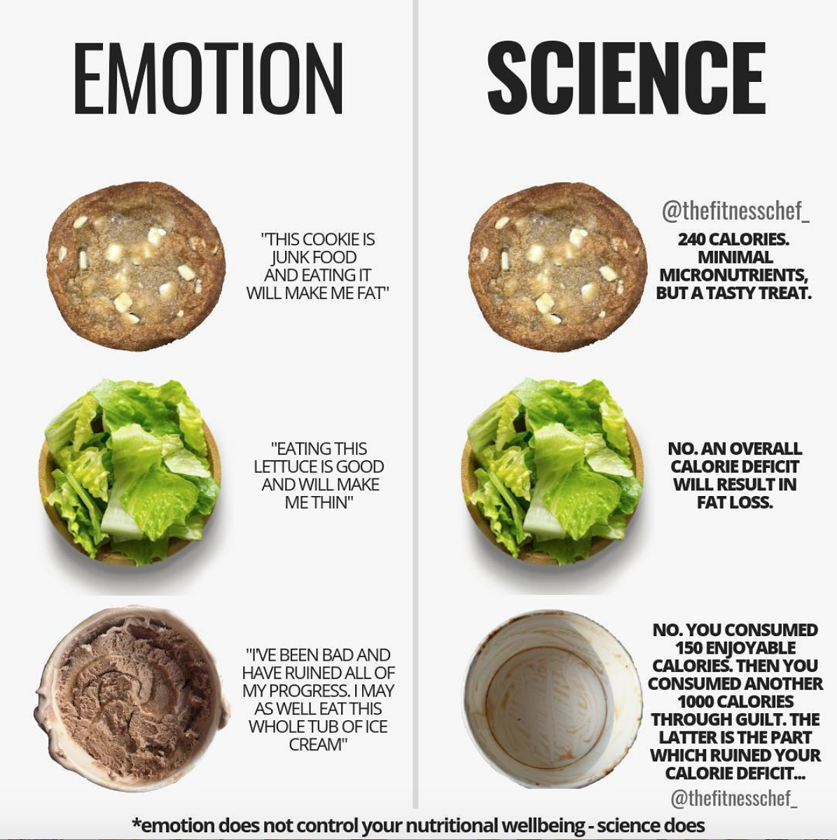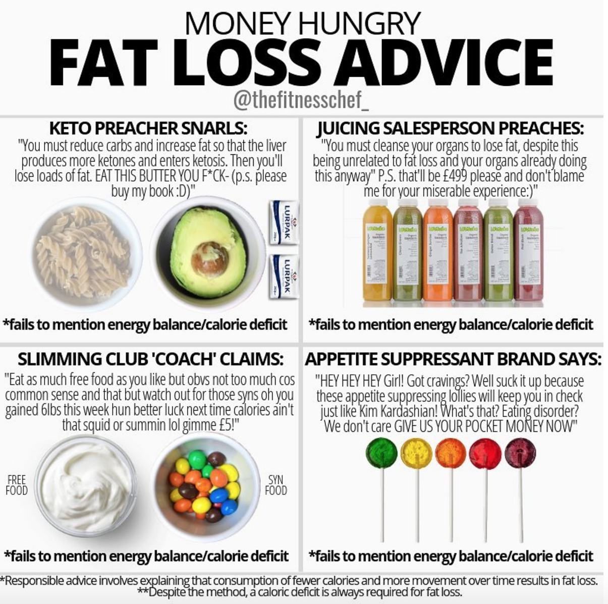 “In the current ‘social media age’, misinformation can infiltrate with ease. As our body fat increases, so does the net worth of those who capitalize on us through ultimately useless advice, which fails to deliver the most basic narrative for fat loss. A calorie deficit.”