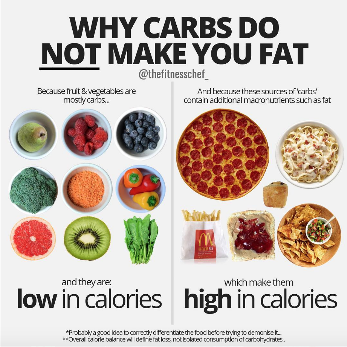 “The immediate problem with such a dubious claim is the mirky differentiation of carbohydrates as an entity within edible food. Pizza, pasta, chips, bread and pastry all fall inside the umbrella of “Don’t eat it because it’s got carbs and you’ll get fat.” Yet if we examine the exact ingredients in such food we can immediately assert that carbohydrates are not the only caloric variable present. The examples displayed on the right of this graphic represent foods which contain calories from carbs, protein and more pertinently, fat – which houses caloric density.”