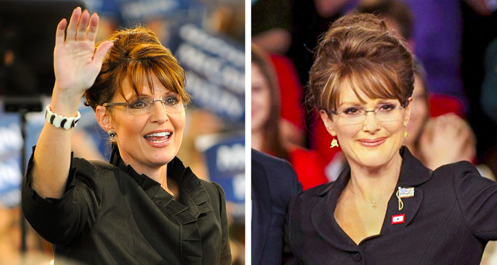 Everyone knows that Tina Fey can play a spoof of Sarah Palin better than anyone, so seeing Julianne Moore play the Politician in the movie Game Change to perfection was surprising at first. With Palin’s signature hair-up and rimless galsses, Julianne Moore could pass as Palin in sweats a t-shirt.