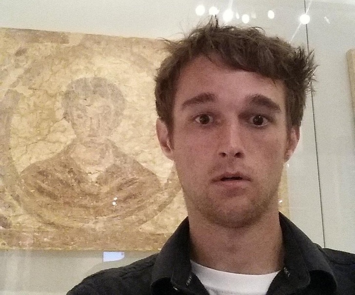 34. “It only took 16 hours of travel to find this guy wearing the same wacky parrot shirt in Rome.”