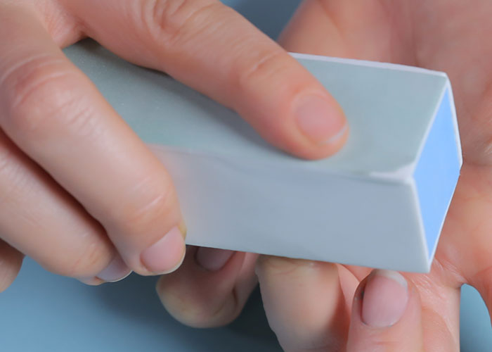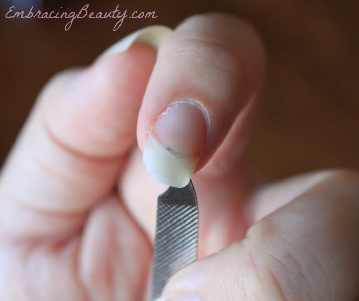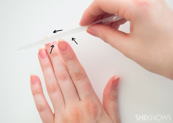 Some people think you file your nails back and forth with the nail file, but this causes frays in the nail. Instead, file in just one direction only for a smooth tip. Start in one corner and file to the center in one direction. Then to the other corner and to the center.