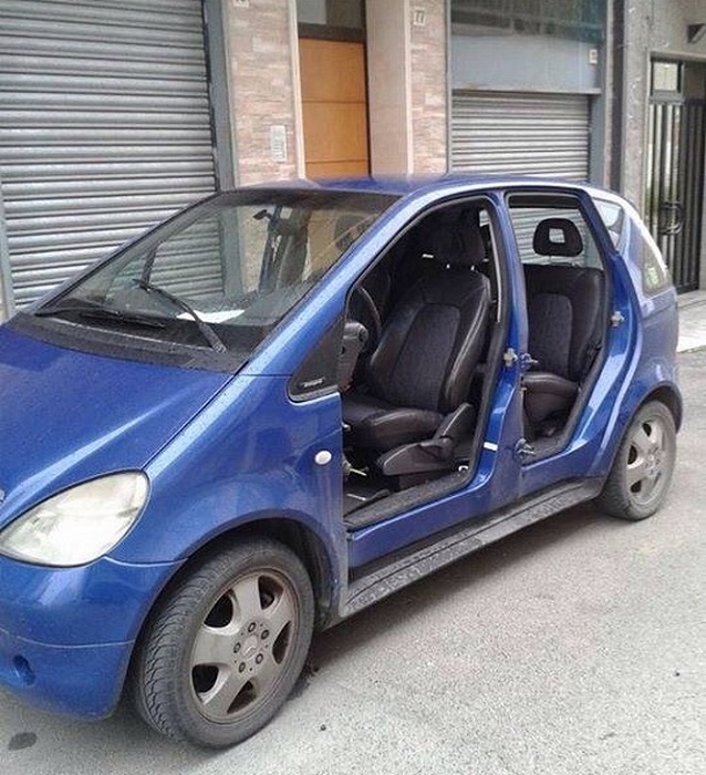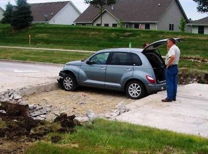This poor man has a look of complete defeat on his face as he contemplates his car. It fits so perfectly in that spot, which means, of course, that it’s wedged tight. If I were him, I might just turn around and go back to bed.