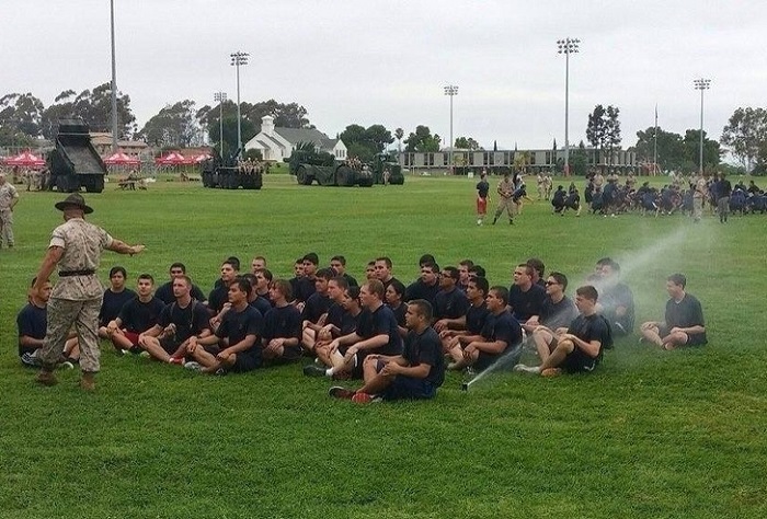 This really begs the question: did the instructor know the sprinklers were still on? Either he forgot there was lawn maintenance or he knew and he just allowed it. This poor guy had a rough day, but the others probably thought it was hilarious.