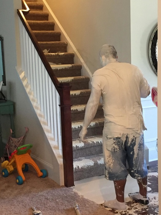 This one is so tragic, it’s funny. This poor man fell down the stairs holding a five-gallon bucket of paint. Forget trying to clean paint off the inside of a car — how on earth is he going to get all that off himself?