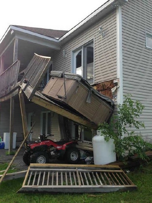 You know it’s a bad day when your back deck just completely falls off your house with no warning. That’s something you can’t always prepare for. Lucky for these homeowners, it looks like it didn’t do too much damage to the house or their vehicle.