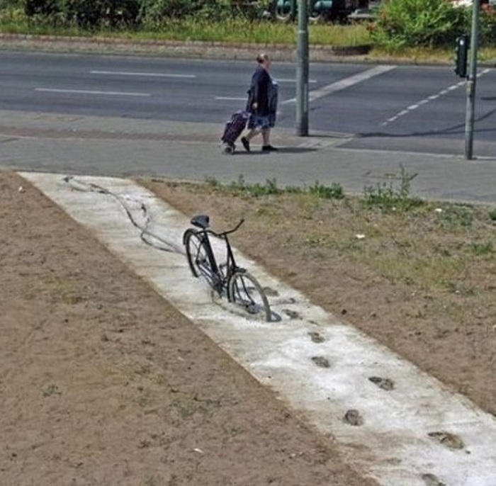 This bicycle and the ensuing footprints tell a story, don’t they? And what a tragedy it is. Apparently, the construction crew forgot to put up signs that day, which meant that someone lost a bike.