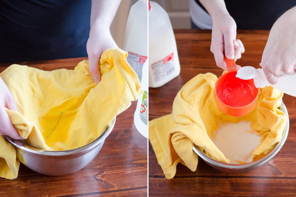 Do your white t-shirts have yellow armpit stains on them? Pour some lemon juice and water over the stain and work it into the stain. Let the shirt dry in the sun. Add some baking soda to your lemon and water mixture for extra tough stains.