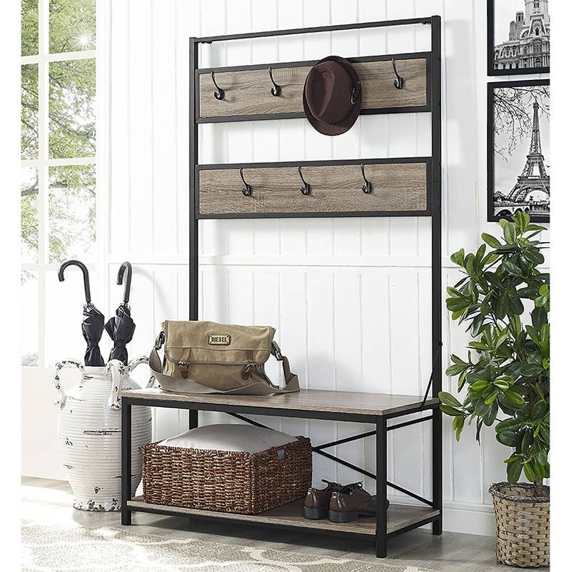 17. A hall tree with seven hooks to hang coats, hats, and even umbrellas after you get stuck in a downpour you were not prepared for.
