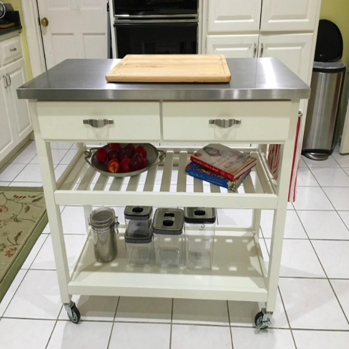 Promising review: “Perfect island for our kitchen. I painted it white and it worked perfectly. I took a small piece to Sherwin Williams for advice. They recommended lightly sanding each piece, painting with a primer, and then painting with ProClassic Waterbased Acrylic-Alkyd paint. It worked great. The island is sturdy, and the drawers are huge. I lined the drawers with silver contact paper that matches the stainless steel top. The wheels lock in place, I love that we can move it around if needed. We had been looking for the right island for our kitchen for over a year, and this was it!” —Laura S.