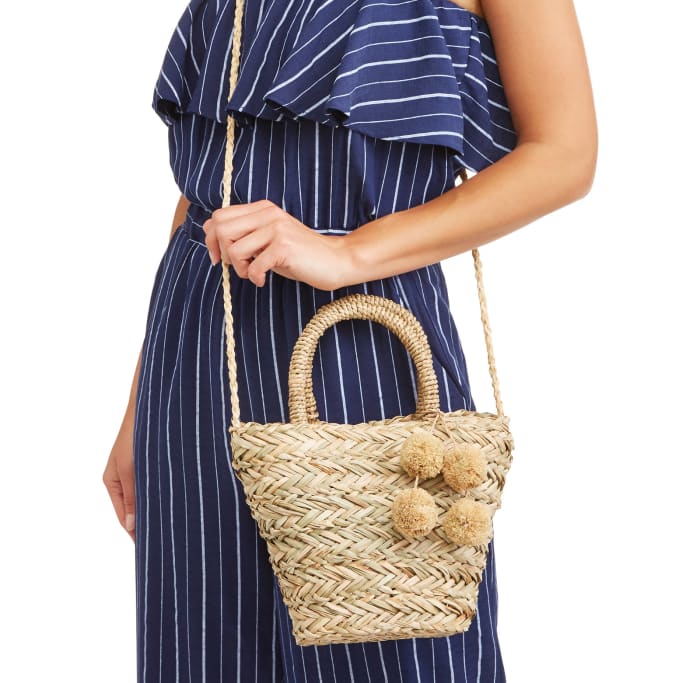 2. A seagrass tote with raffia pompoms so you can try two summertime trends at once: straw accessories *and* the mini bag.
