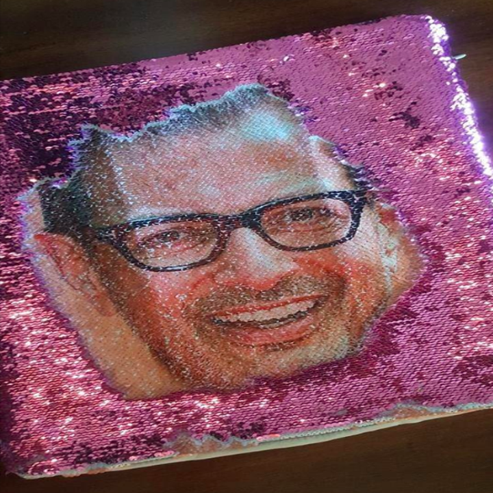 6. A sequin pillowcase with a hidden portrait of Jeff Goldblum. Opt for the pink sequins when you have guests, swipe the sequins away to reveal your beloved when the guests finally go away.