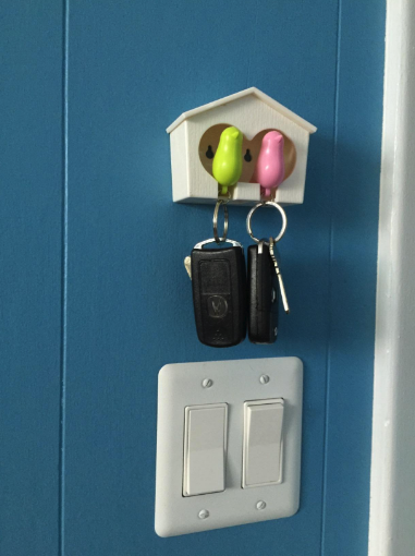 Each keychain features a tiny bird that you put into its house whenever you’re home. The birds are also tiny whistles!