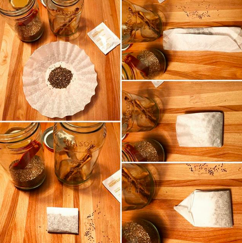 You can make your own elaborate tea blends by using a coffee filter as the tea bag. Place your ingredients in the center of the filter, then roll the sides in so you have a rectangle. Next fold each side in. You might want to tie the bag to make sure it stays shut!