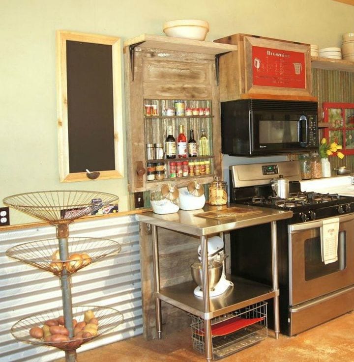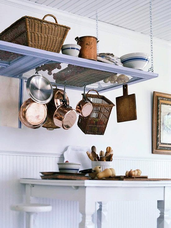 Replace the wood in the body of your door with some panes of glass, hang from the ceiling, attach some hooks, and voila! You have a one-of-a-kind hanging shelf for your kitchen. You can even see what’s stored above!
