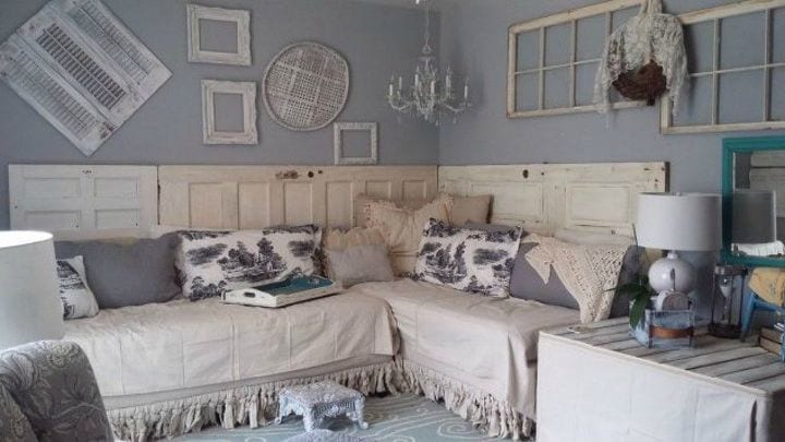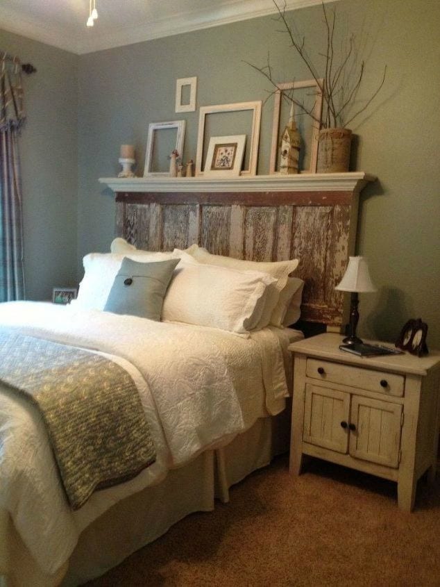 This vintage glass door was positioned above a bed frame to create a shabby chic-looking accent piece for your bedroom. Just gorgeous!