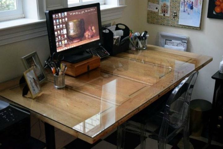 An office desk and workspace has never looked better when you create the desk out of an old door. Stain it in a color that will work for you, attach some legs, and place some glass on top.