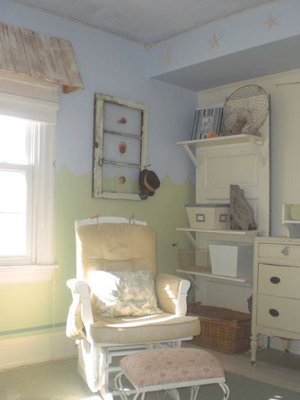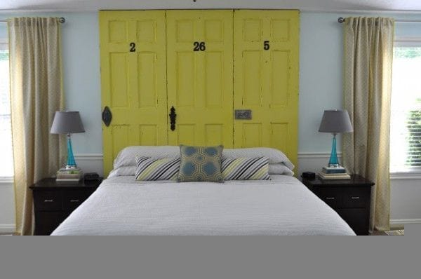 If we’ve learned anything during this slideshow, it’s that old doors are meant to be transformed into headboards. We just love this brightly-colored look contrasting against the neutral-colored wall.