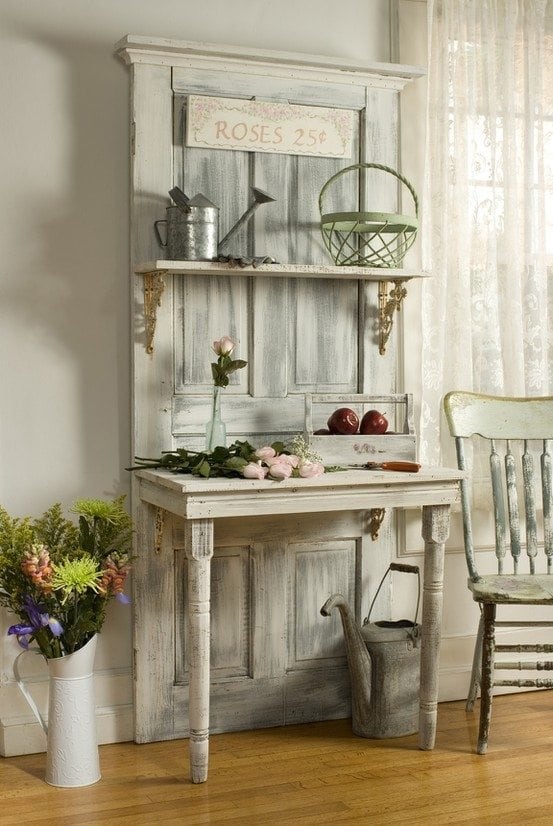This door was combined with a half table and shelf to create an adorable garden station or accent table. Perfect for that farmhouse-chic look that’s so popular right now.