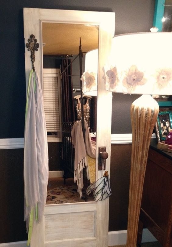 This door was repurposed into a mirror along with a convenient hook to hang clothing from. If your door had a window, simply knock it out and replace with a mirror.