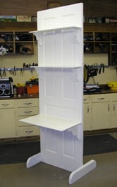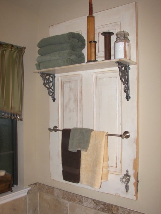 Why go out and buy an expensive bathroom organizer? All you need to do is attach a simple hanging shelf and towel rack to an old door.