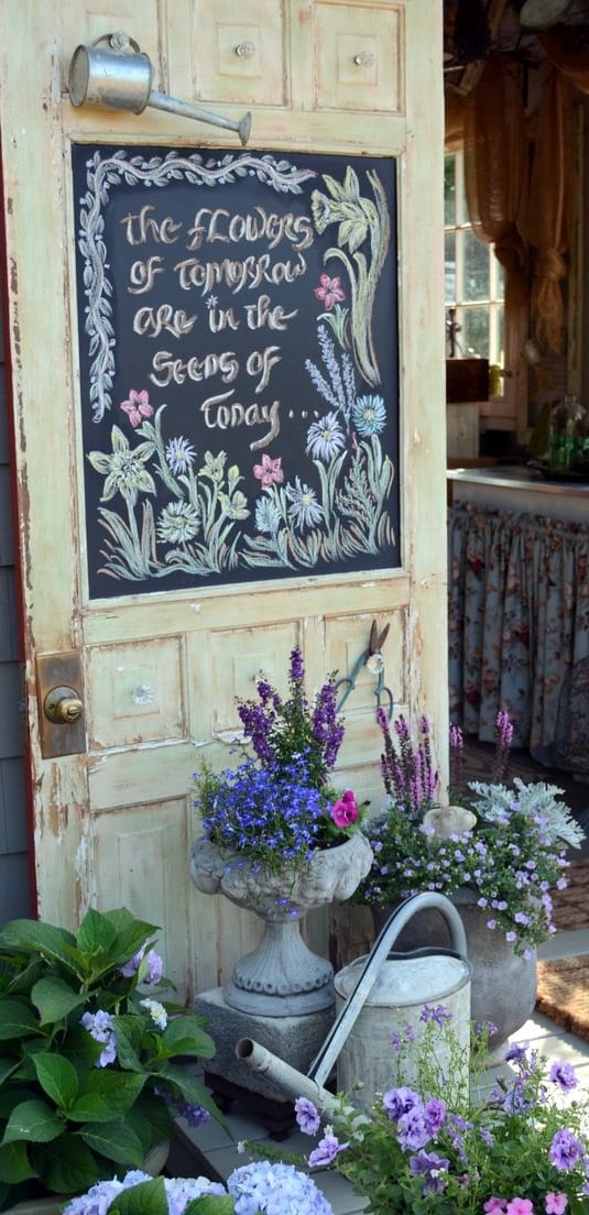 You can turn an old door into a really cool outdoor message board with a coat of chalkboard paint. You can change up your inspirational messages each season. It’s a very simple project to do.
