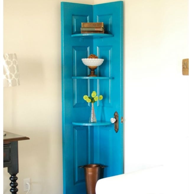 Save some space by cornering your shelving with this colorful old door. The directions can be found here. It’s much easier than you think.