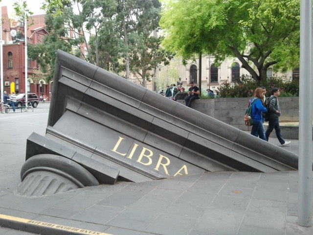 The Architectural Fragment is a sculpture by Petrus Spronk located at the State Library of Victoria on Swanston Street. It looks like a library sinking into the sidewalk. It was built in January 1993.