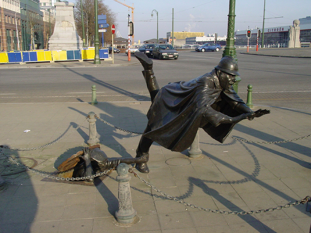This piece is located in Brussels, Belgium. The policeman being caught by a “rogue of the canal” was created by Tom Frantzen. It is meant to represent “the youth making the authority falter.”
