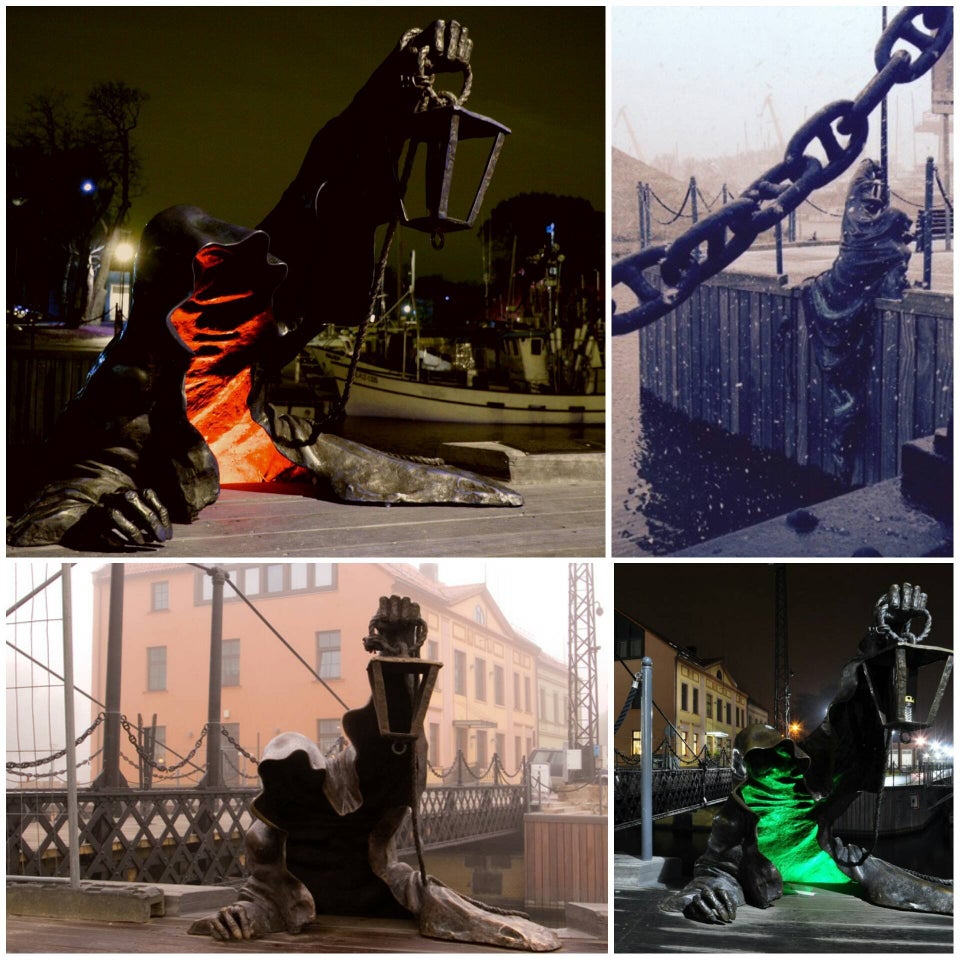 This creepy piece looks like it is slithering out of the sea. The Juodasis Vaiduoklis, or The Black Ghost, is located in Lithuanian and is 7.8 feet high. It was created by Svajunas Jurkus and Sergejus Plotnikovas and shows an eerie figure with skeletal hands holding a lantern and climbing out onto the dock.