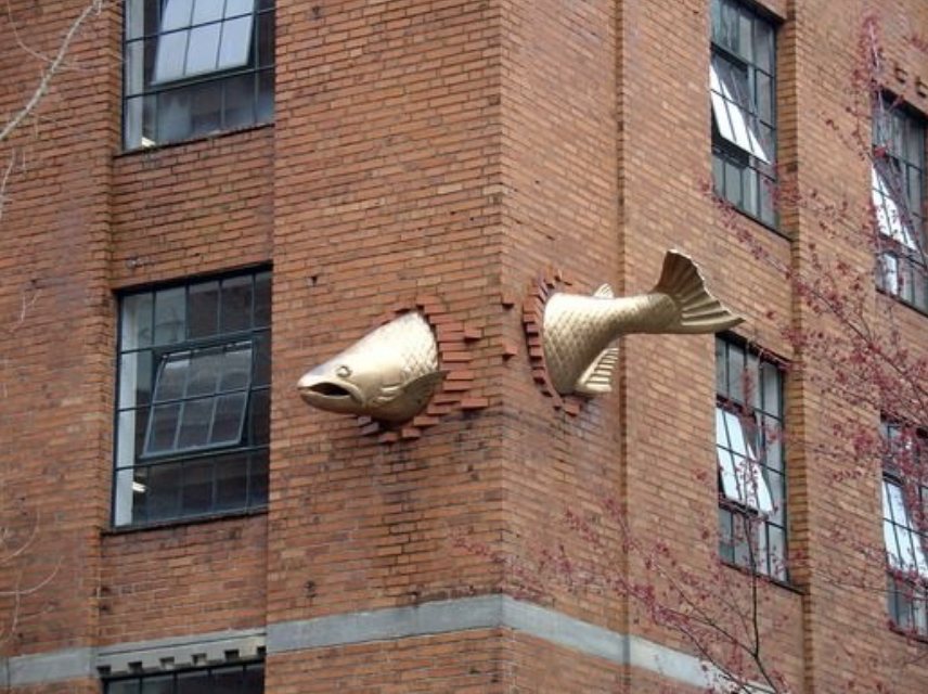 Transcendence is a giant salmon sculpture on the corner of Southwest Salmon Street and Southwest Park Avenue in Portland, Oregon. It was created by Oregonian Keith Jellum. It shows an 11 ft. salmon flying through the brickwork of the building above Southpark Seafood.