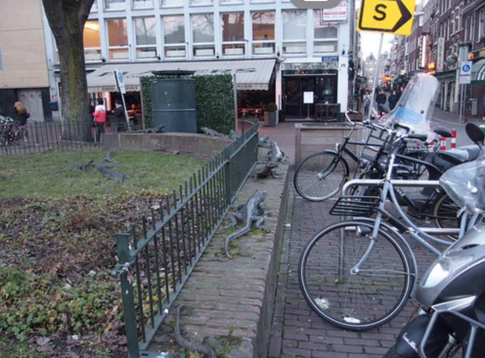 No this park doesn’t have an infestation, these are sculptures. This is Klein-Gartmanplantsoen square in Amsterdam. It contains 40 bronze statutes of lizards and iguanas by artist Hans van Houwelingen.
