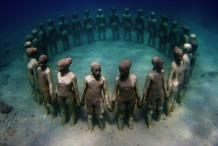 Vicissitudes is an underwater sculpture by Jason de Caires Taylor. It shows life-size figures holding hands in a circle. It’s a part of the Molinere Underwater Sculpture Park in the Caribbean Sea off the west coast of Grenda, West Indies.