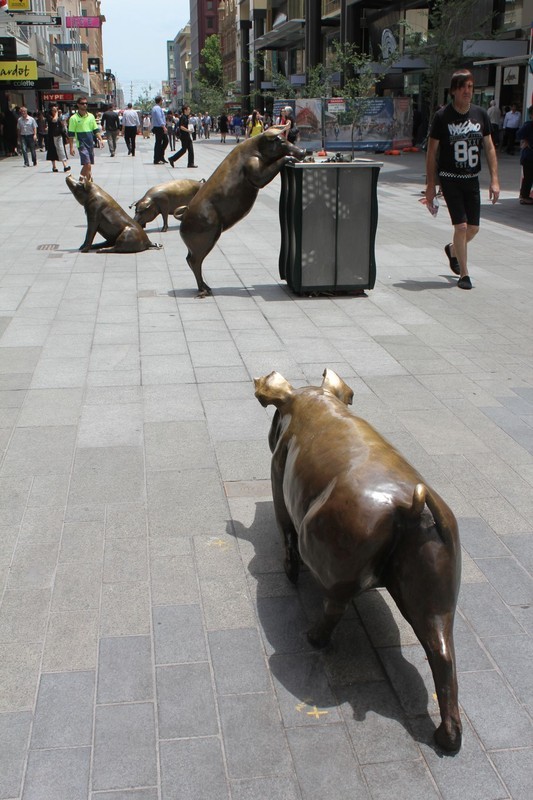 A Day Out is a really cute set of four life-size bronze pig statutes. They look like they are having fun and enjoying their day out in the Rundle Mall in Australia. The piece was named by the public.
