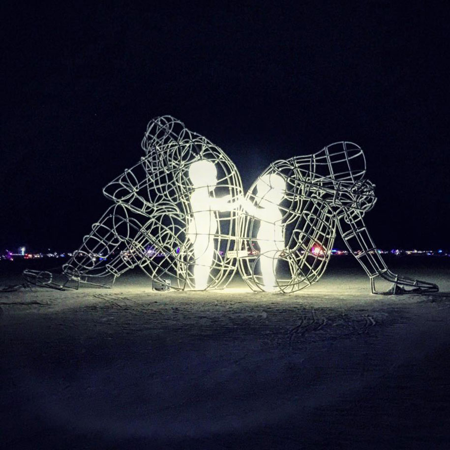 You’re always going to find mindblowing works of art at the Burning Man Festival. Alexander Milov’s Love is one of the most memorable. It shows two adults with their backs turned to each other while their inner children who are illuminated and unified.