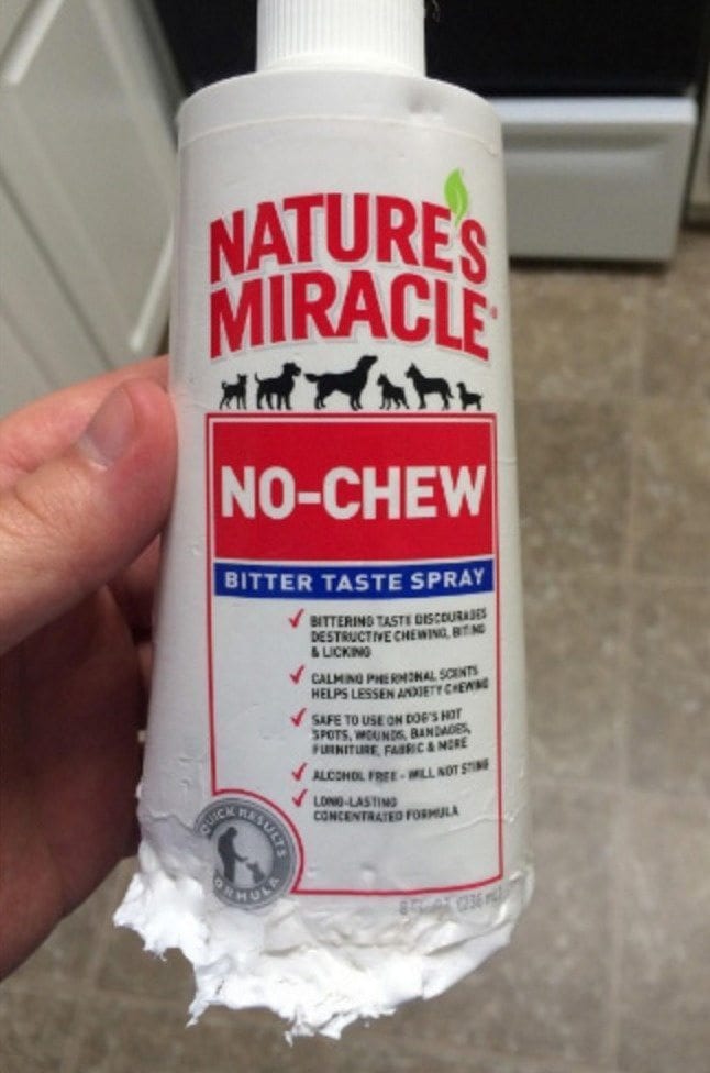 This a no-chew spray. Forumulated to prevent animals from chewing on stuff. They need to make it in a chew-proof bottle.